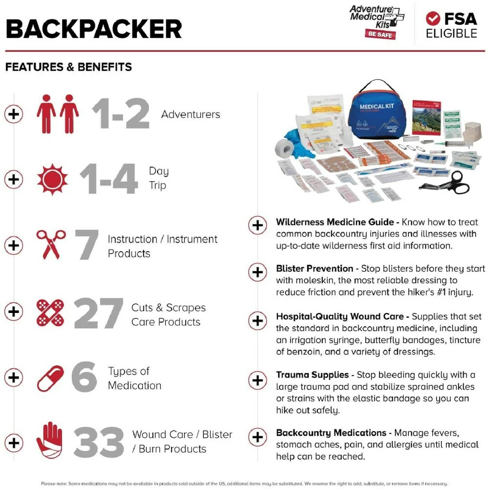 Adventure Medical Kits Mountain-Series Backpacker kit is made for a 2 outdoor explorers on a 4-day foray into the wilderness. It has remedies for cuts, allergies, upset stomach and dehydration.