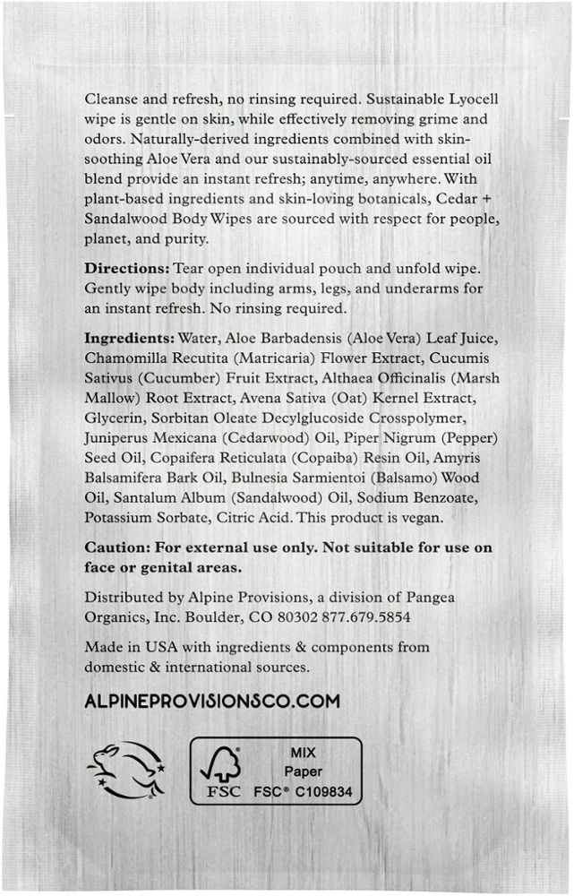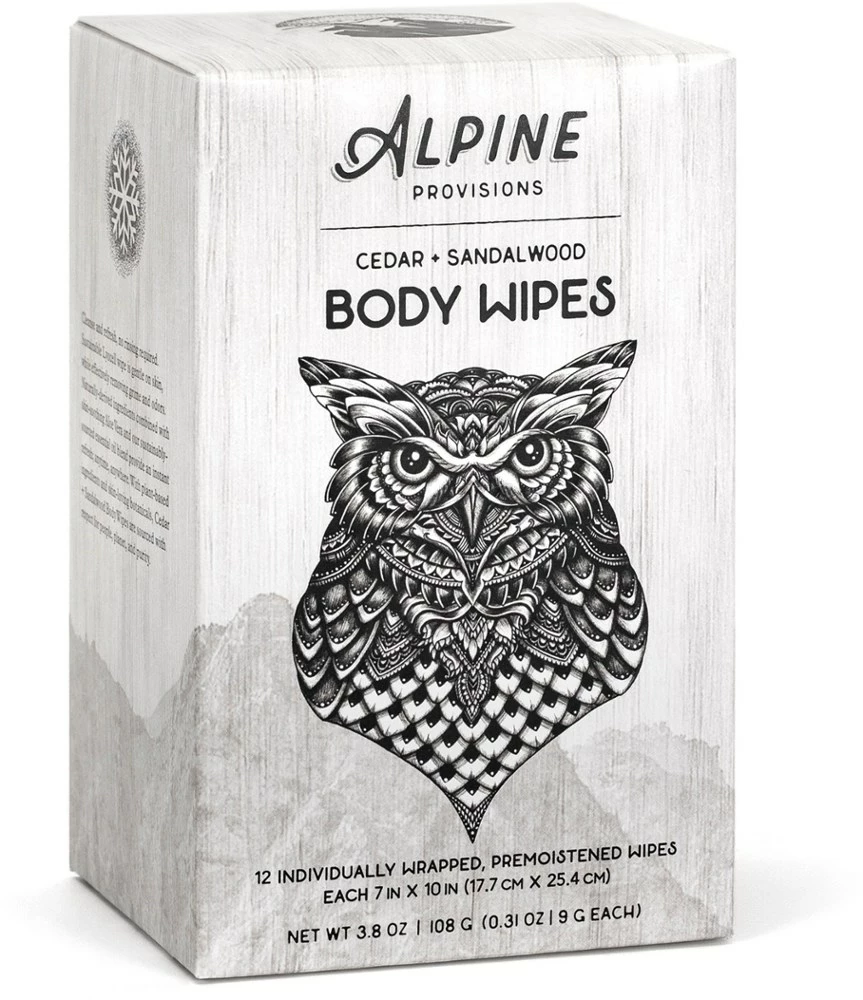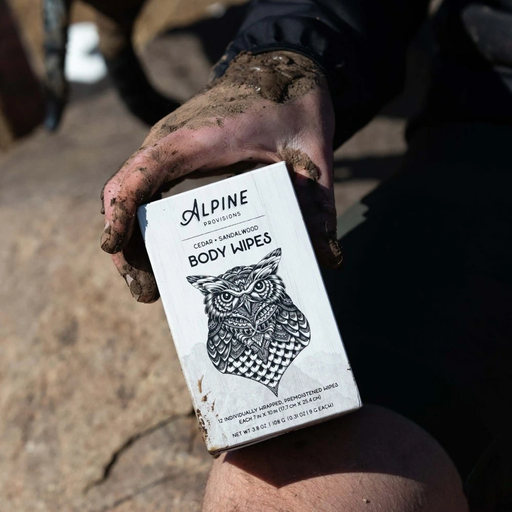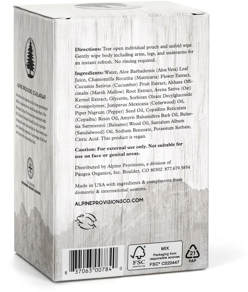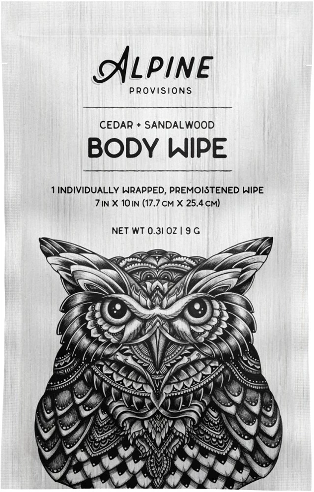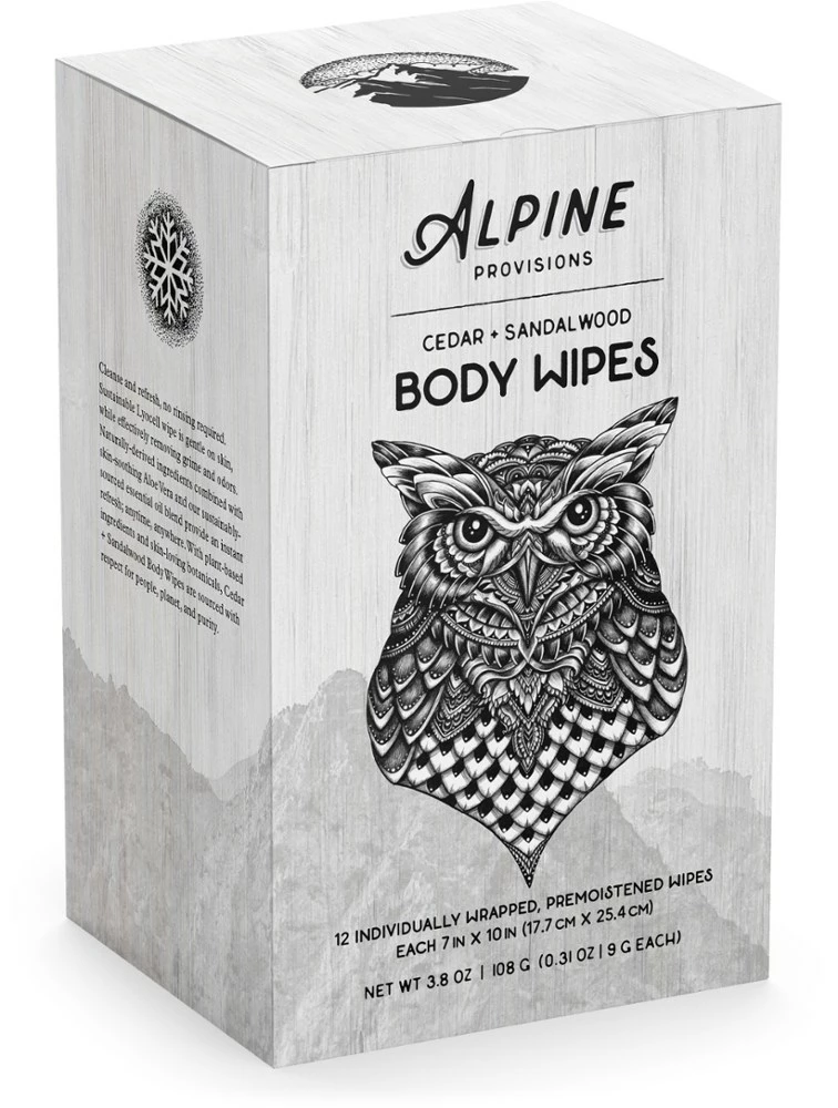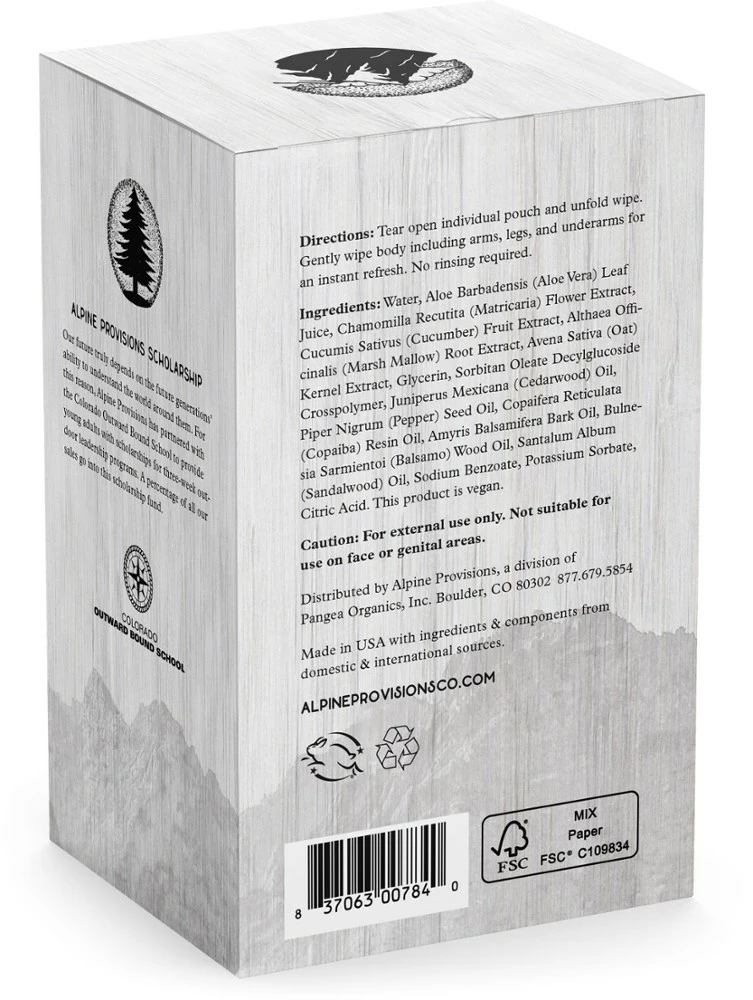 Providing an instant refresh anytime, anywhere, the Alpine Provisions Body Wipes clean and soothe your skin and require no rinsing—just wipe and go.