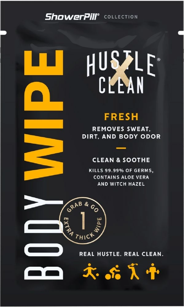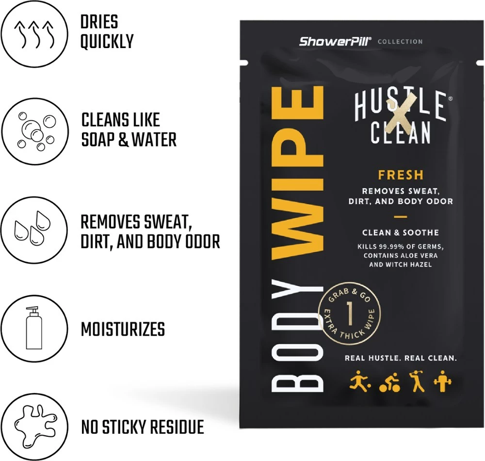 When you need a convenient way to freshen up, reach for the Hustle Clean body wipes. These antibacterial body wipes are great for removing sweat, dirt and body odor after a workout or adventure.