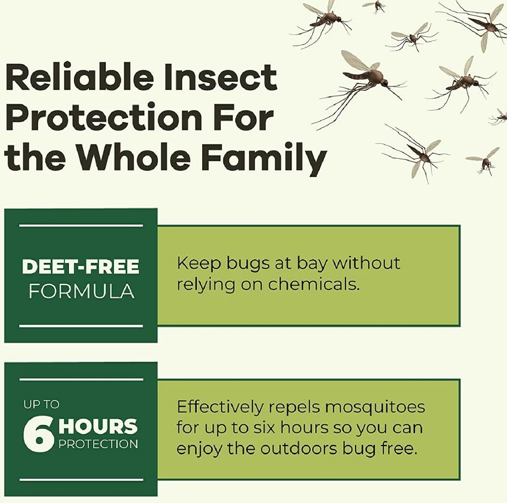 - Plant-based bug spray uses lemon eucalyptus oil to repel mosquitoes for up to 6 hrs.