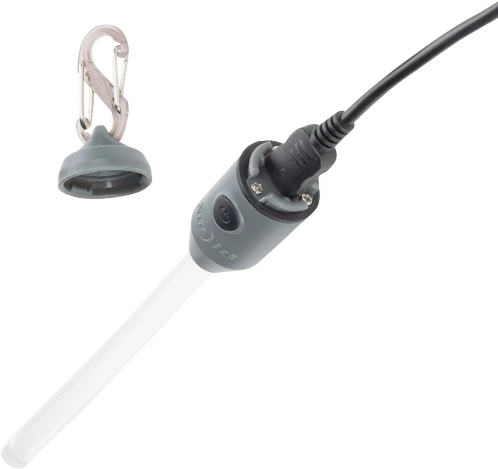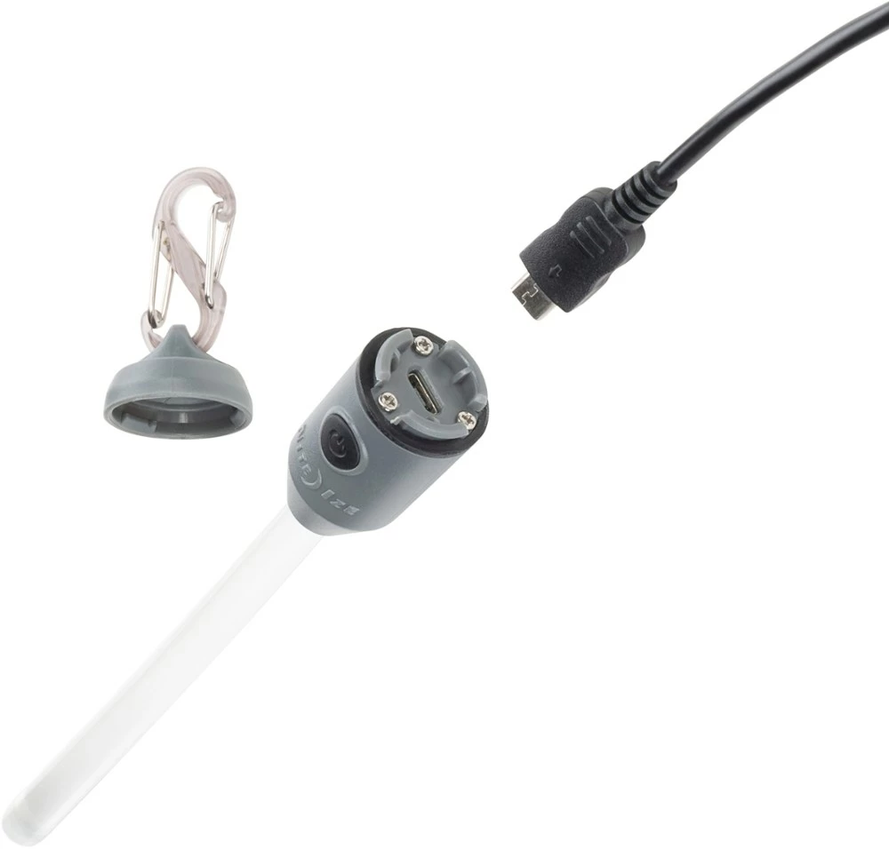 - Unscrew detachable top with included S-Biner to access charging port