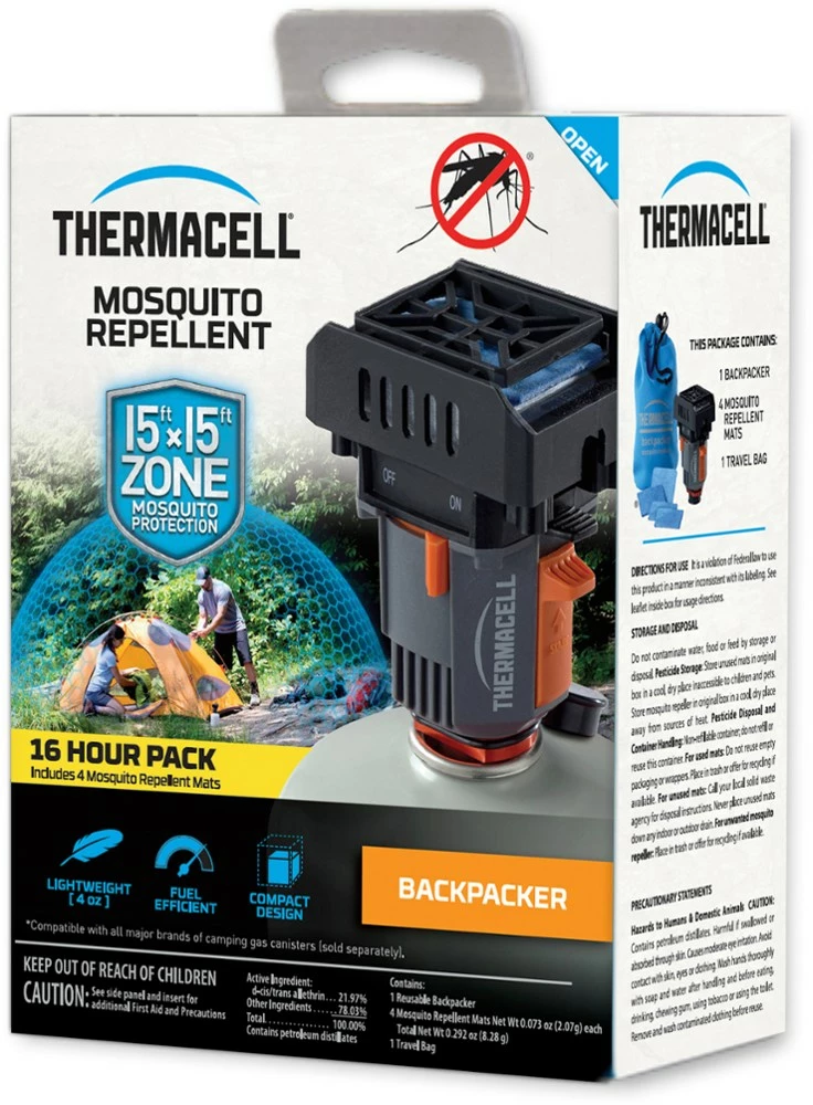 Using heat generated by your backpacking stove fuel canister, the compact and lightweight Thermacell Backpacker Mosquito Repeller effectively repels mosquitoes by creating a 15 ft. protection zone.
