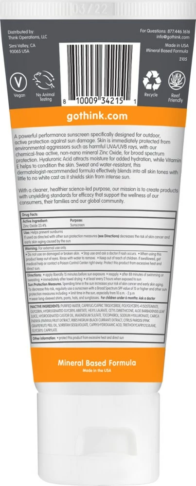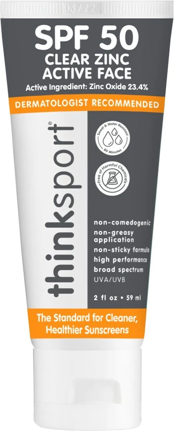 Dermatologist recommended sun care for the family, Thinksport Clear Zinc Active Face SPF 50 sunscreen’s nontoxic, effective, zinc oxide–enriched formula rubs on clear with little to no whitening.