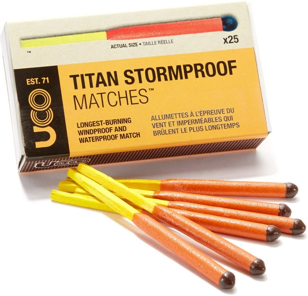The beefy, long-burning, UCO Titan Stormproof matches measure over 4 in. long, sport a burn time of up to 25 seconds, will fire up in harsh conditions, and even light after being submerged in water.